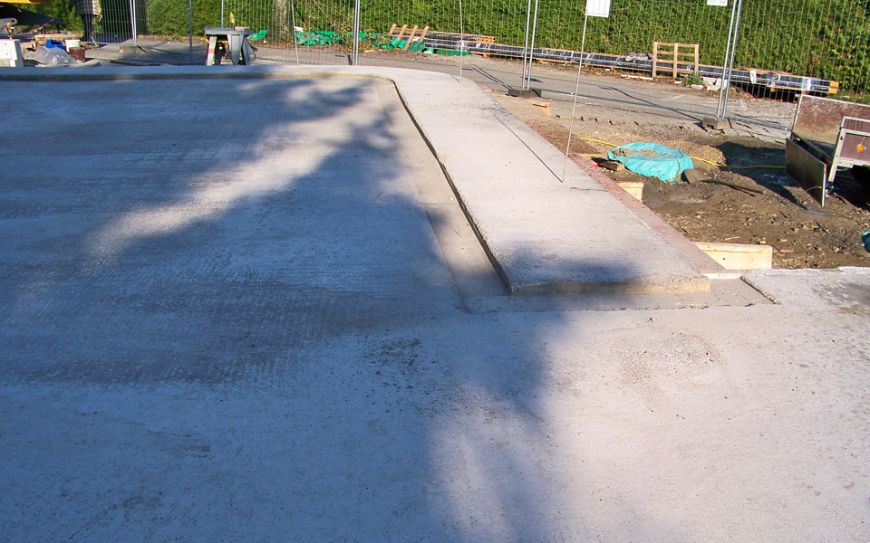 Ausgeführte Arbeiten: Kleinere Abbrucharbeiten, Entwässerungs-arbeiten mit Versetzen des Fettabscheiders, Erdarbeiten, Fundamentarbeiten, Betonieren der Stahlbetonbodenplatte mit Aufkantung bei der Rundung und einer Rampe.Architekt: hauserpartner, Altensteig Baujahr: 2015 Parkhaus am Klinikum, Friedrichshafen