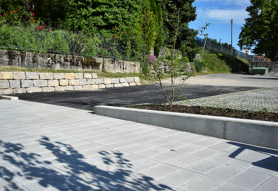 Ausgeführte Arbeiten: Altes Pflaster ausbauen und entsorgen, neues versickerungsfähiges Pflaster verlegen, abrütteln und ausfugenBaujahr: 2016 Friedhof Sichtbetonmauer, Friedrichshafen