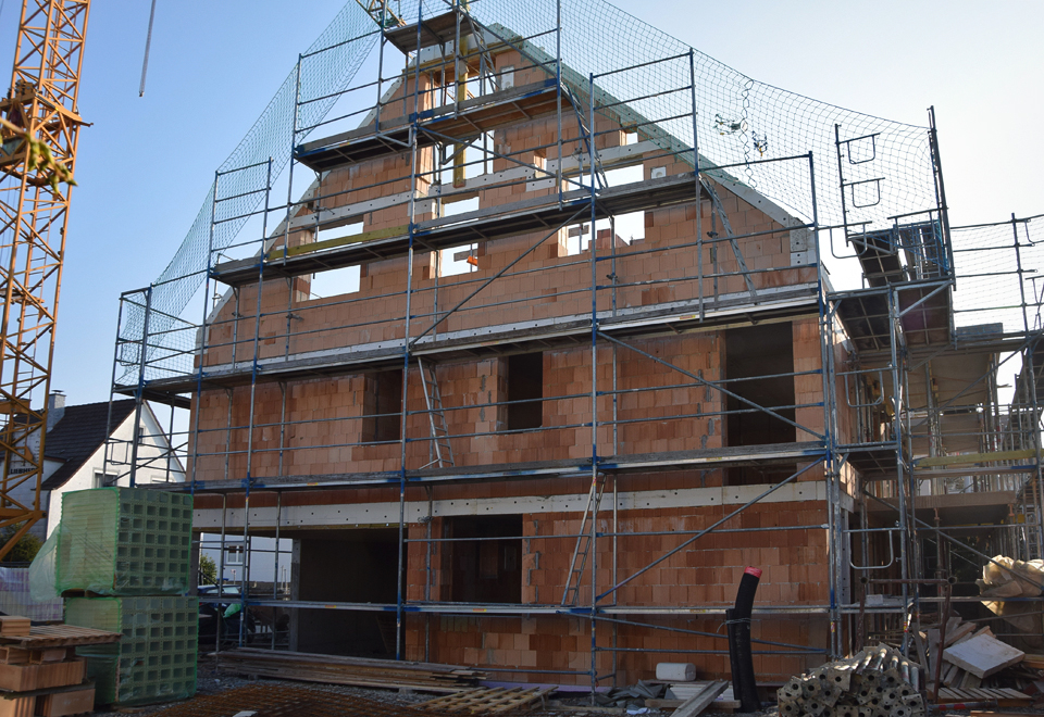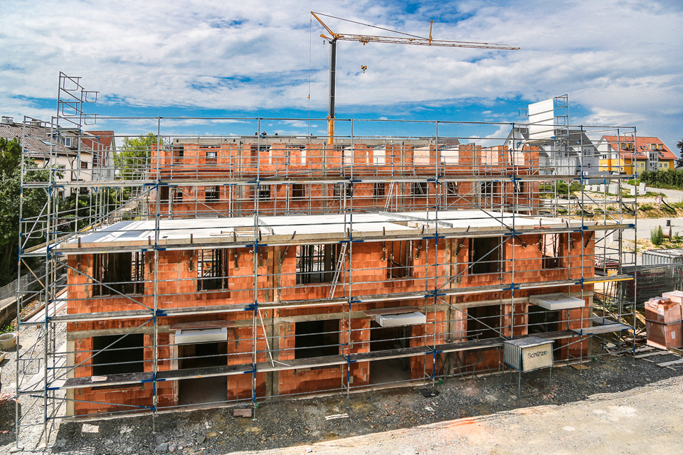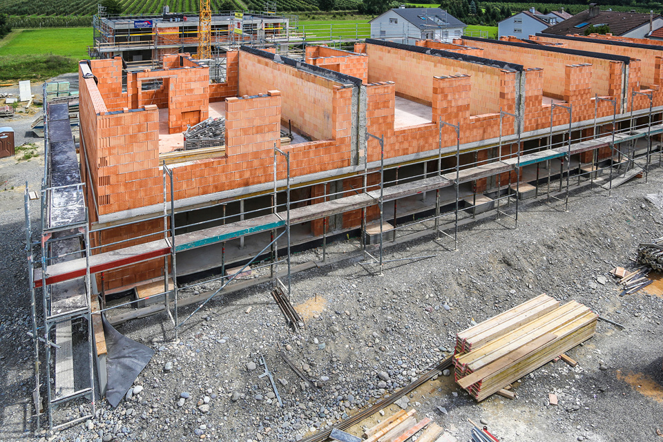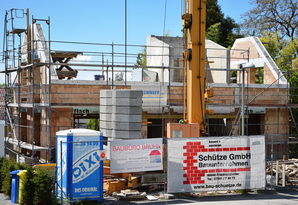 Ausgeführte Arbeiten: Erdarbeiten, Entwässerung, Weiße Wanne im Keller, Stahlbetonaufzugschacht, Versetzten von Stahlbetonfertigteilen wie Balkonen und Treppenläufe, hoch wärmegedämmtes Außenmauerwerk, Hochlochziegelmauerwerk im Innenbereich, Kalksandsteinmauerwerk für den Schallschutz, StahlbetonarbeitenArchitekt: Architekturbüro Holz + Kortner, Friedrichshafen Statik: Ingenieurbüro Wolfgang Abts, Friedrichshafen Baujahr: 2015 11-Familienhaus mit 29 Reihenhäuser, Friedrichshafen