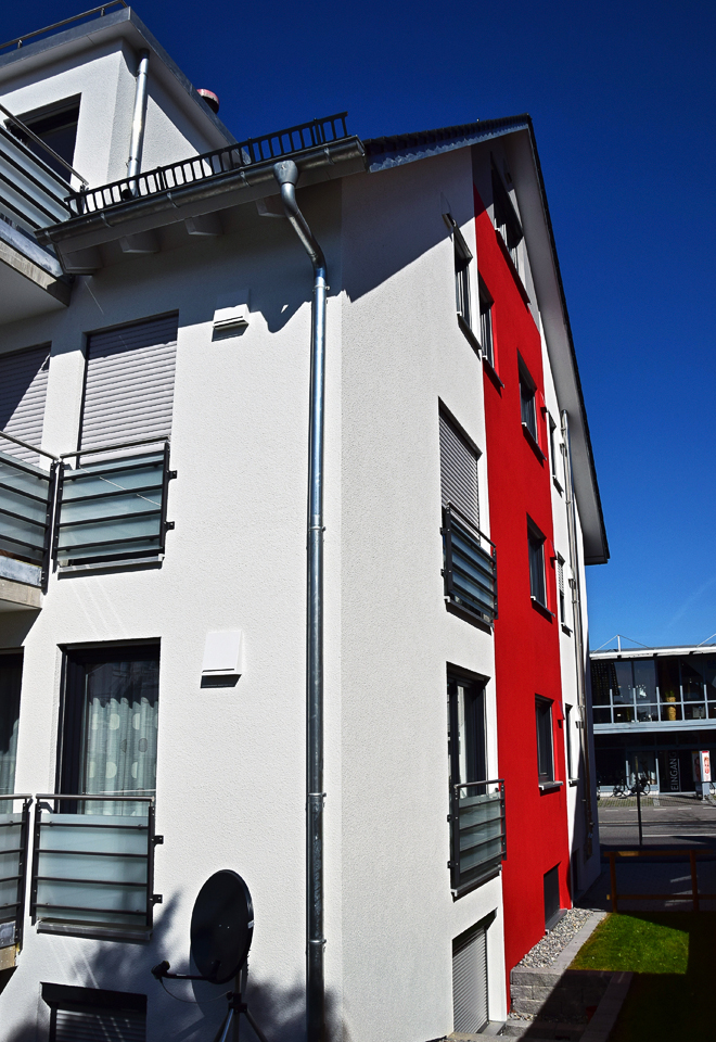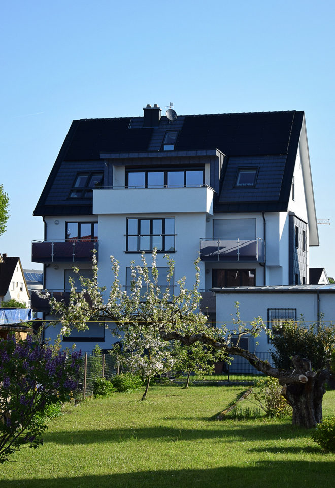 Ausgeführte Arbeiten: Entwässerungsleitungen, WU-Pumpen-Architektur und Bauleitung: Baubüro Bruhn, Friedrichshafen Statik: Andreas Dummel, Friedrichshafen Baujahr: 2017 6-Familienhaus, Friedrichshafen