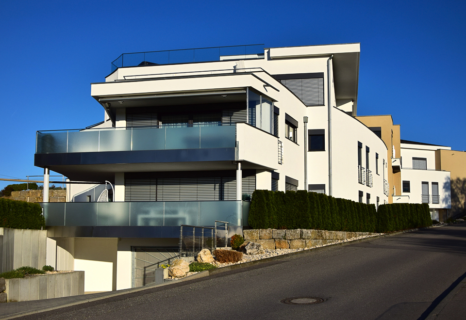Ausgeführte Arbeiten: Stahlbetonarbeiten mit Rundungen in verschiedensten Formen und Varianten, versetzen von Fertigteiltreppen mit gerundeten Wangen und MaurerarbeitenBauträger: Sylt Exklusivbau GmbH Baujahr: 2010 7-Familienhaus mit Tiefgarage, Friedrichshafen